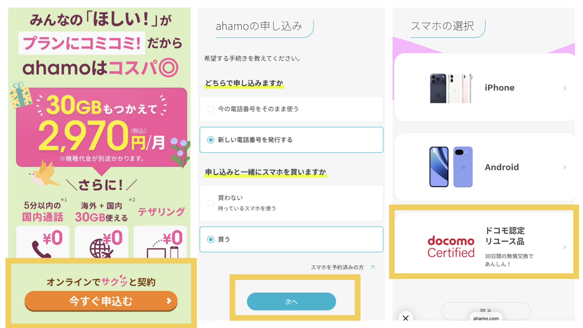 割引条件:オンラインにてahamo契約と同時に対象機種の購入を行った場合