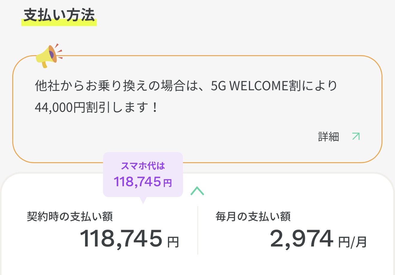 乗り換え+スマホを購入⇒一括払いを選び申し込み登録の最終ページまで進むと、5G Welcome割が適用されて74,745円になります。分割払いを選ぶと1円/月でレンタル可能。