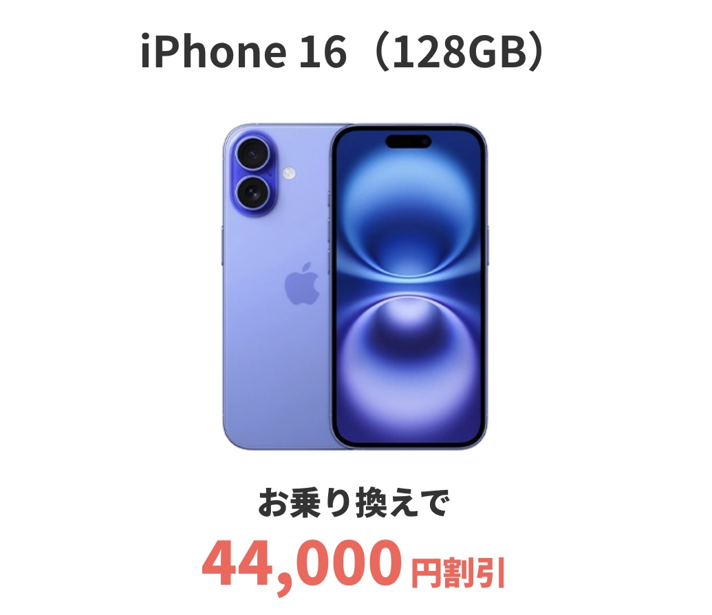 iPhone16 128GB 他社からの乗り換えで44,000円値引き