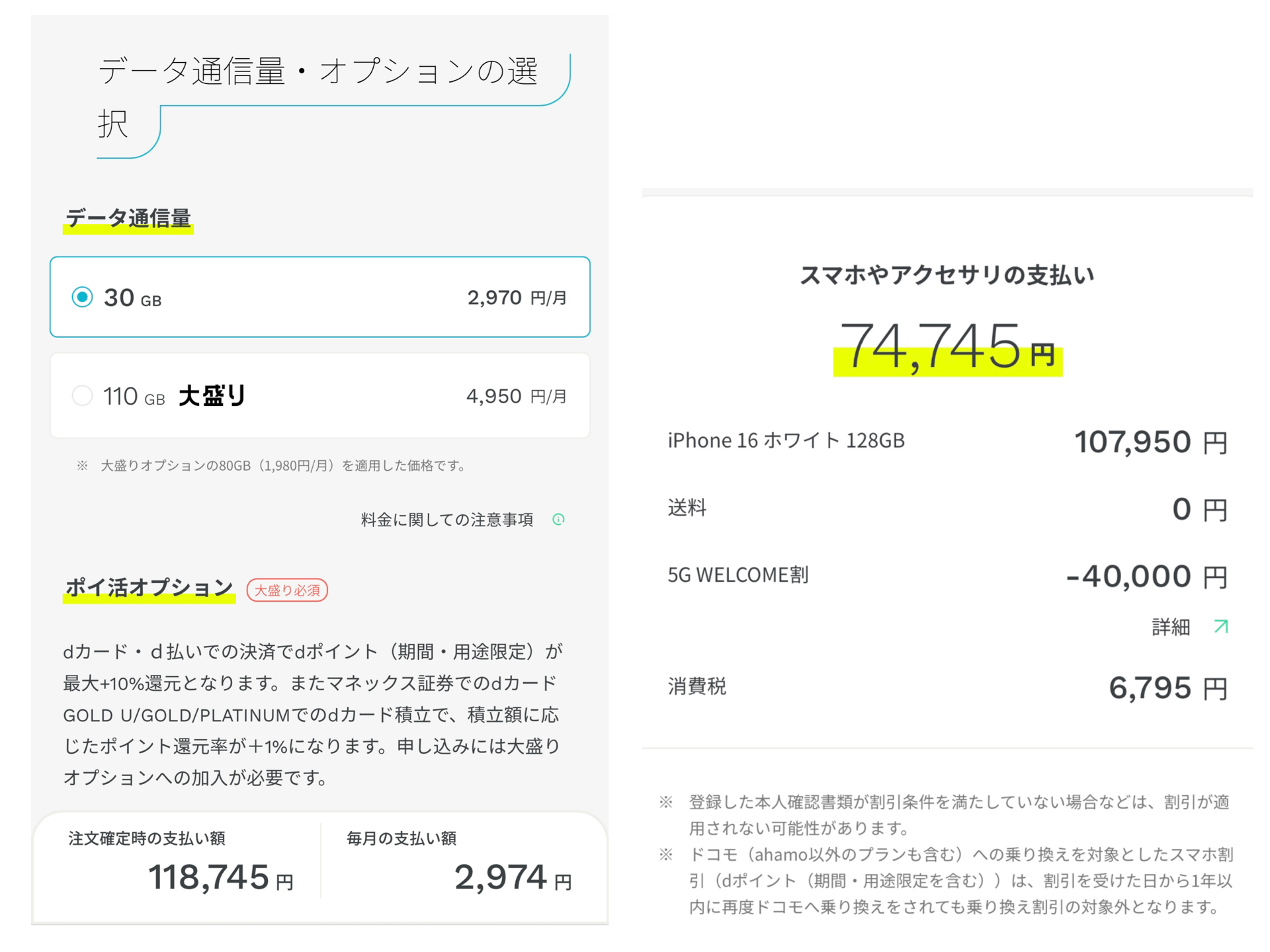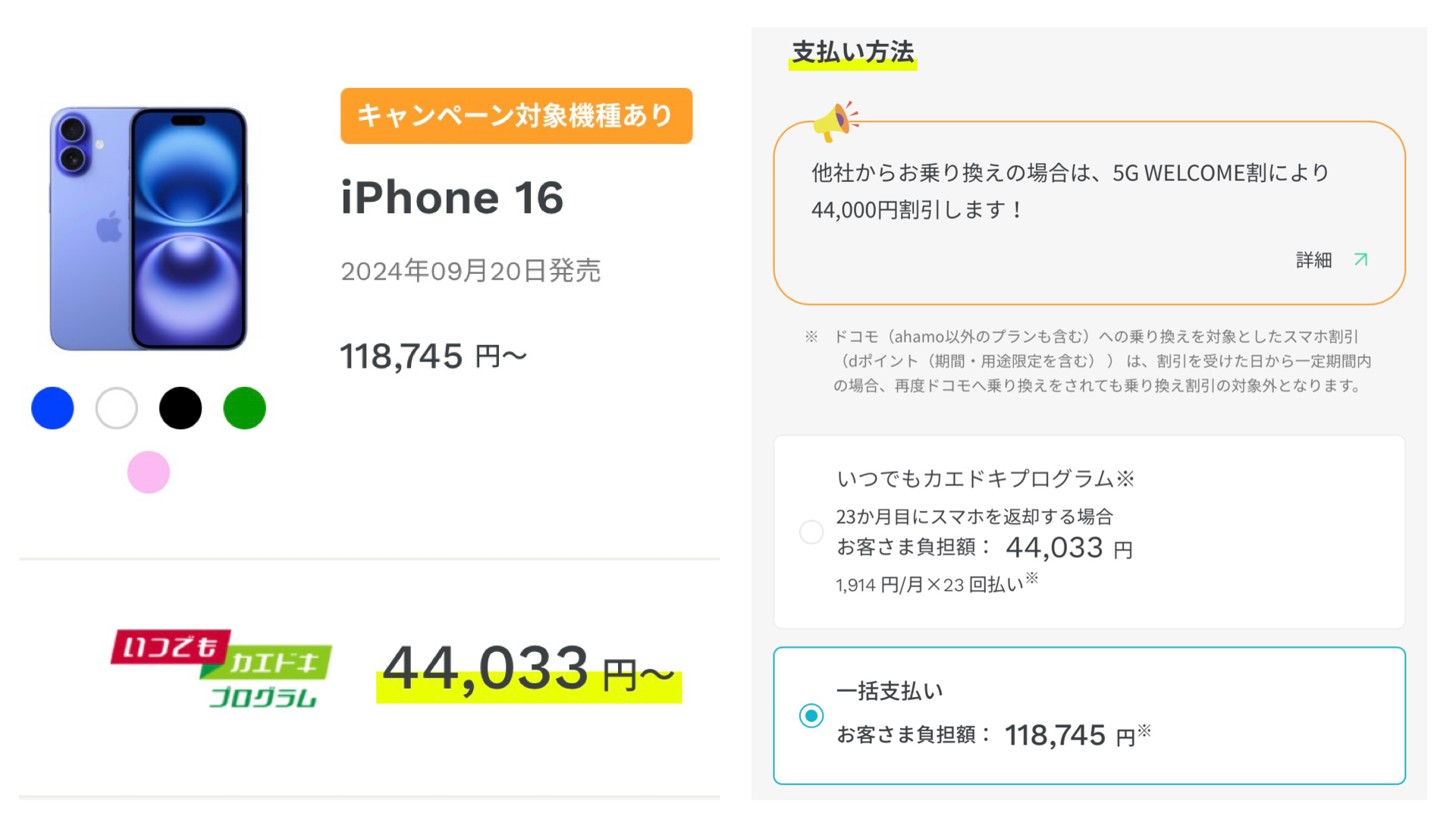 《ahamo》他社からの乗り換えでiPhone16が一括購入44,000円割引74,745円で買える!SIM単体での契約もおトク dポイント20,000相当プレゼント
