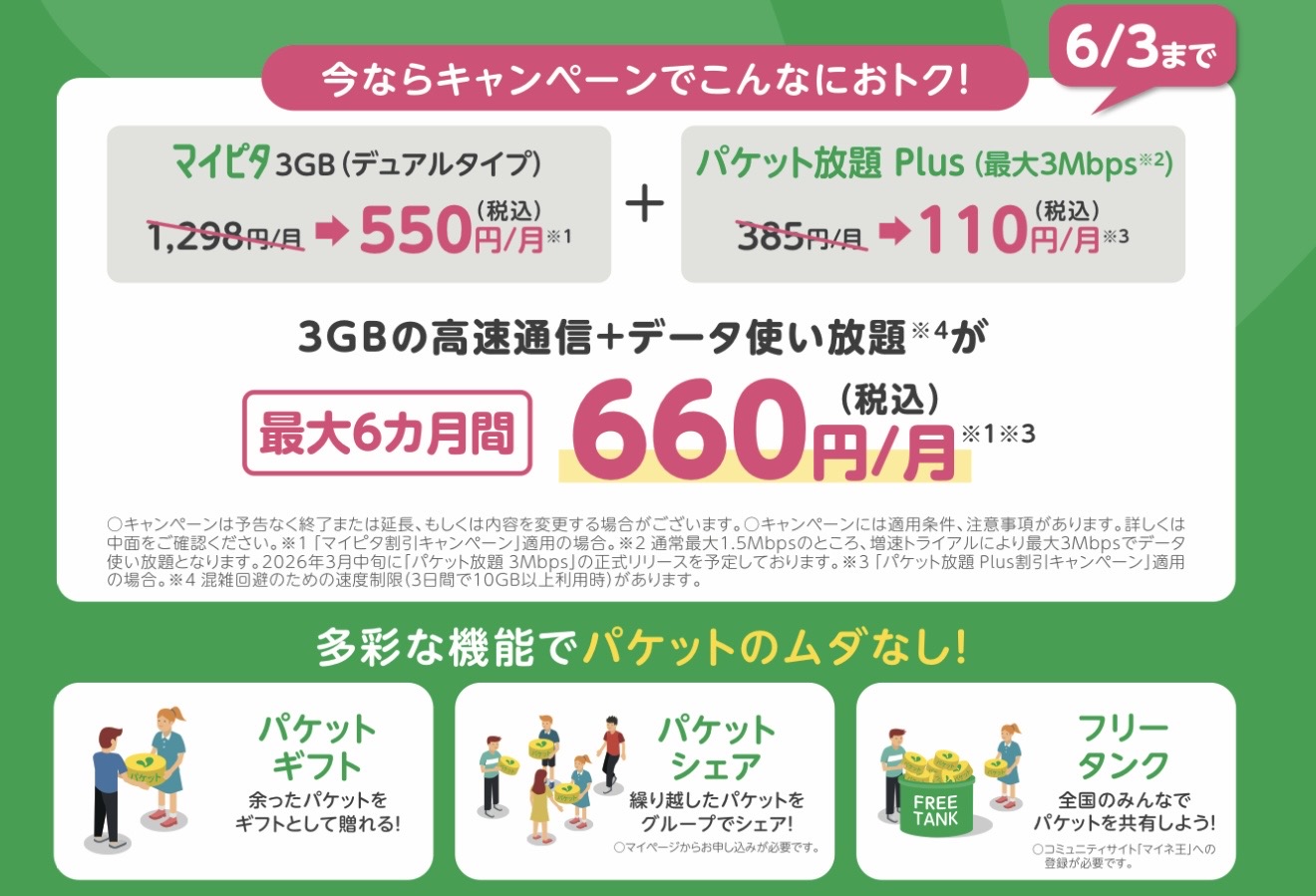 今なら3GBのコースがなんと550円/月で最大6ヵ月使えます!ギガが心配な方はパケット放題Plus(110円/月)を付けるだけでメイン回線としてガンガン使えるので超おすすめ!
