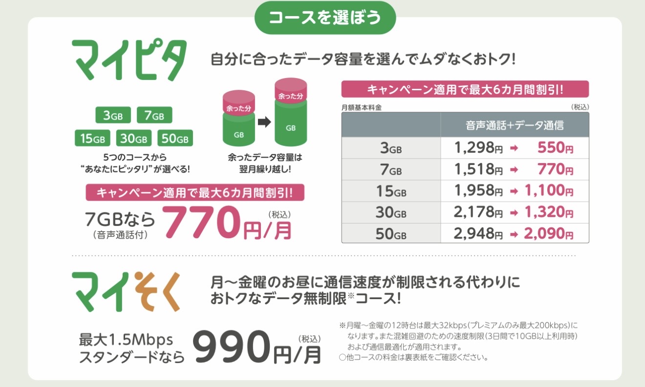 「マイピタ」と「マイそく」どちらかライフスタイルに合ったプランを選んでくださいね!