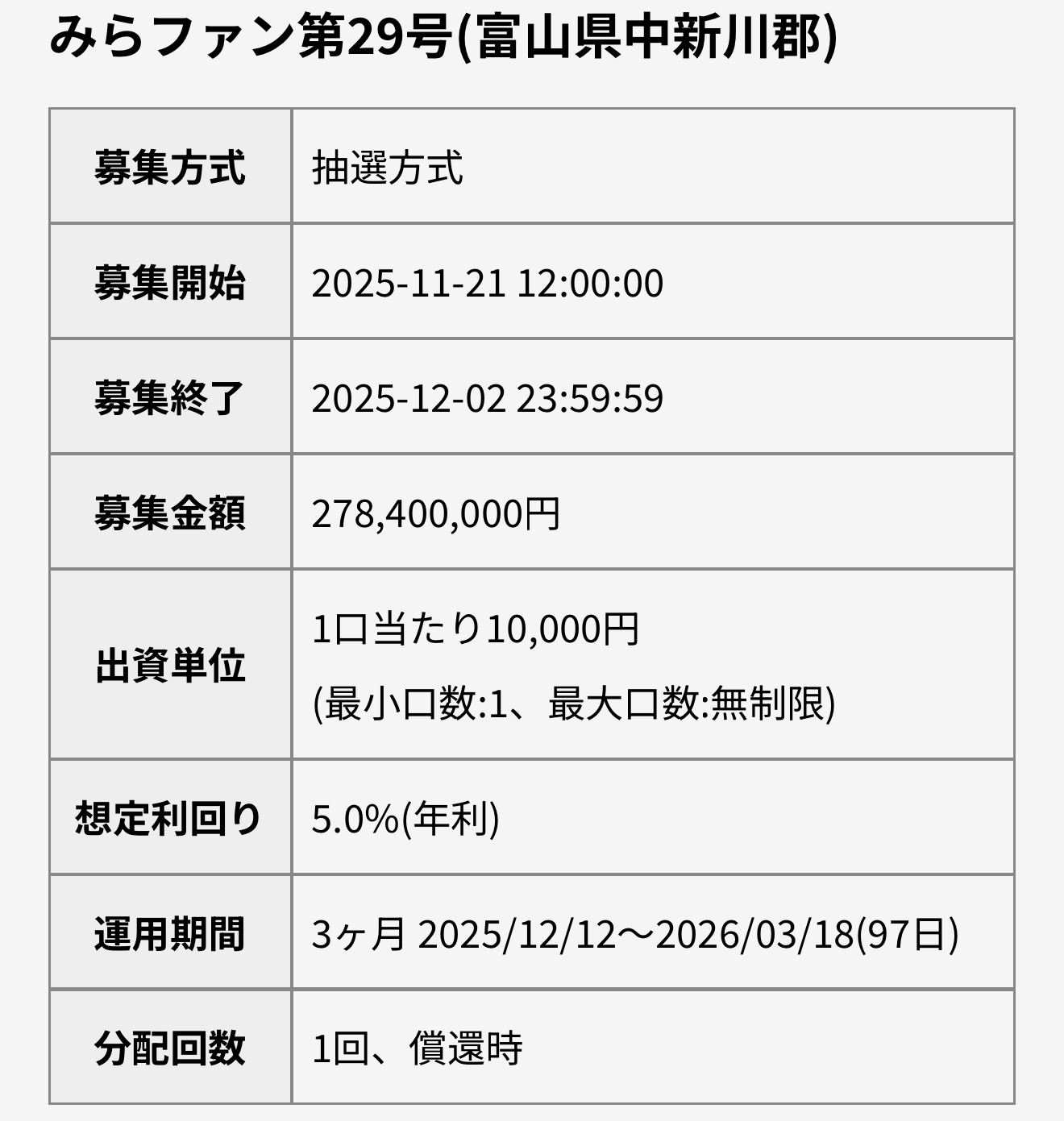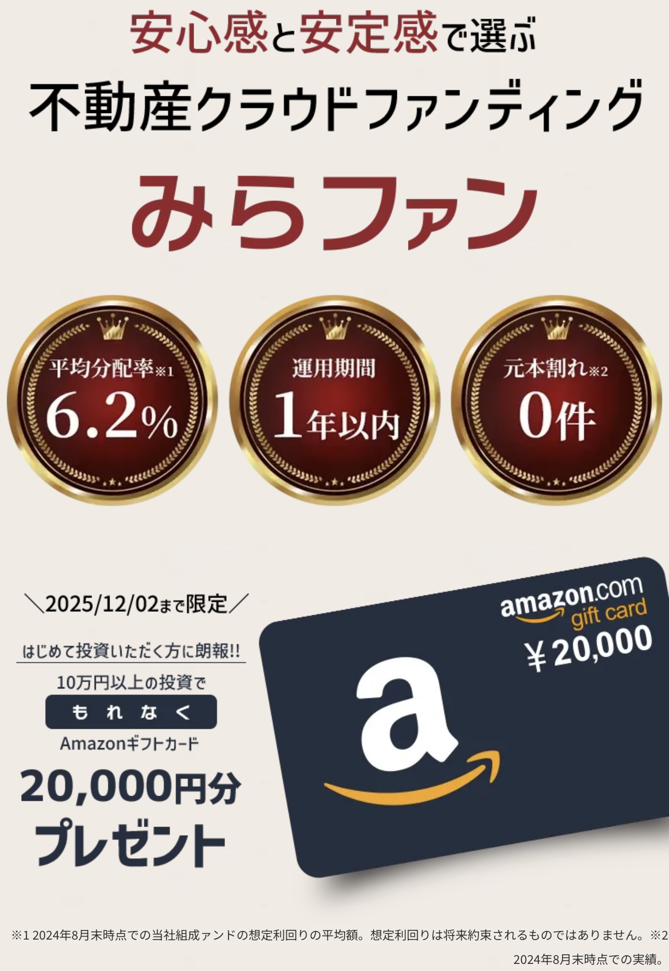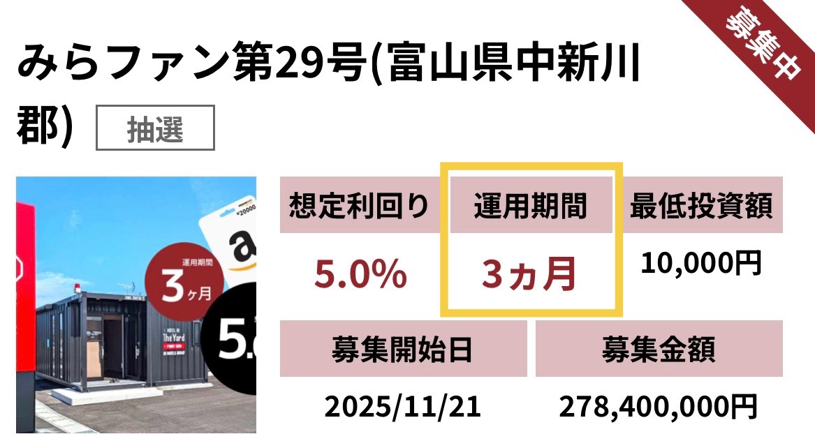 お得情報 《みらファンはじめましてキャンペーン》初回10万円以上の投資でもれなくAmazonギフト2万円分プレゼントの大盤振る舞い 2025.11.26更新 [広告・PR] カンタン、1分で完結みらファン公式サイトはこちら 《急げ》12/2までのチャンス!みらファン申込はこちら こえだ みらファン第29号へ10万円以上の初回投資をすると、Amazonギフトカードがもれなく2万円もらえる! Screenshot ブンチョー 運用期間はたったの3ヵ月と、はじめて投資する方にもピッタリ! こえだ 会員登録から本人確認コードの到着(書類郵送)まで時間がかかる事があるのでお急ぎを! Screenshot カンタン、1分で完結みらファン公式サイトはこちら 《急げ》12/2までのチャンス!みらファン申込はこちら