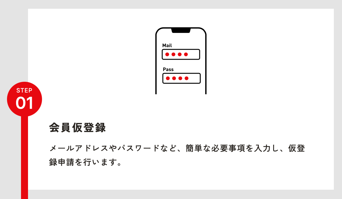 まずは、メールアドレスやパスワードなど、簡単な必要事項を入力し、仮登録申請を行います。