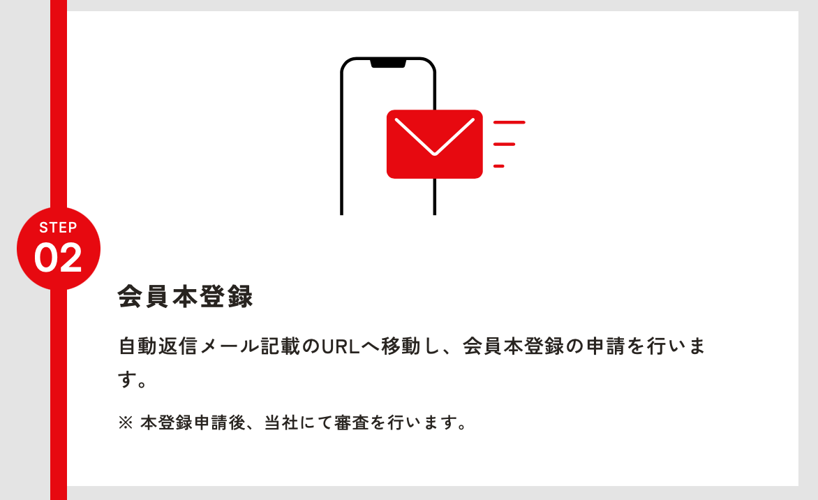 自動返信メール記載のURLへ移動し、会員本登録の申請を行い、本登録申請後に、審査を行います。