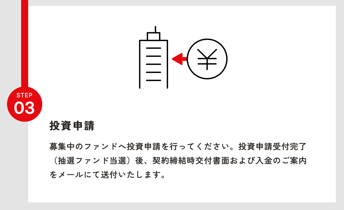 募集中のファンドへ投資申請を行い、投資申請受付完了(抽選ファンド当選)後、契約締結時交付書面および入金の案内がメールで送付されます。