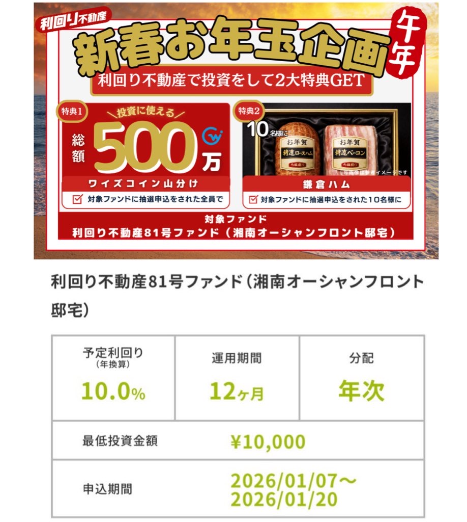 第81号ファンドの申し込みで500万ワイズコインを山分け!さらに鎌倉ハムが当たる