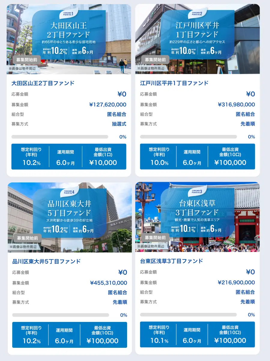 1号は抽選式、2~4号は先着順。1号の最低出資は1万円、2~4号は10万円。ぜんぶ12時に募集開始。