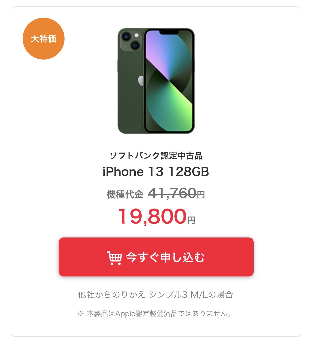 【特別価格】iPhone13 (ソフトバンク認定中古品)128GBが機種変更で29,520円