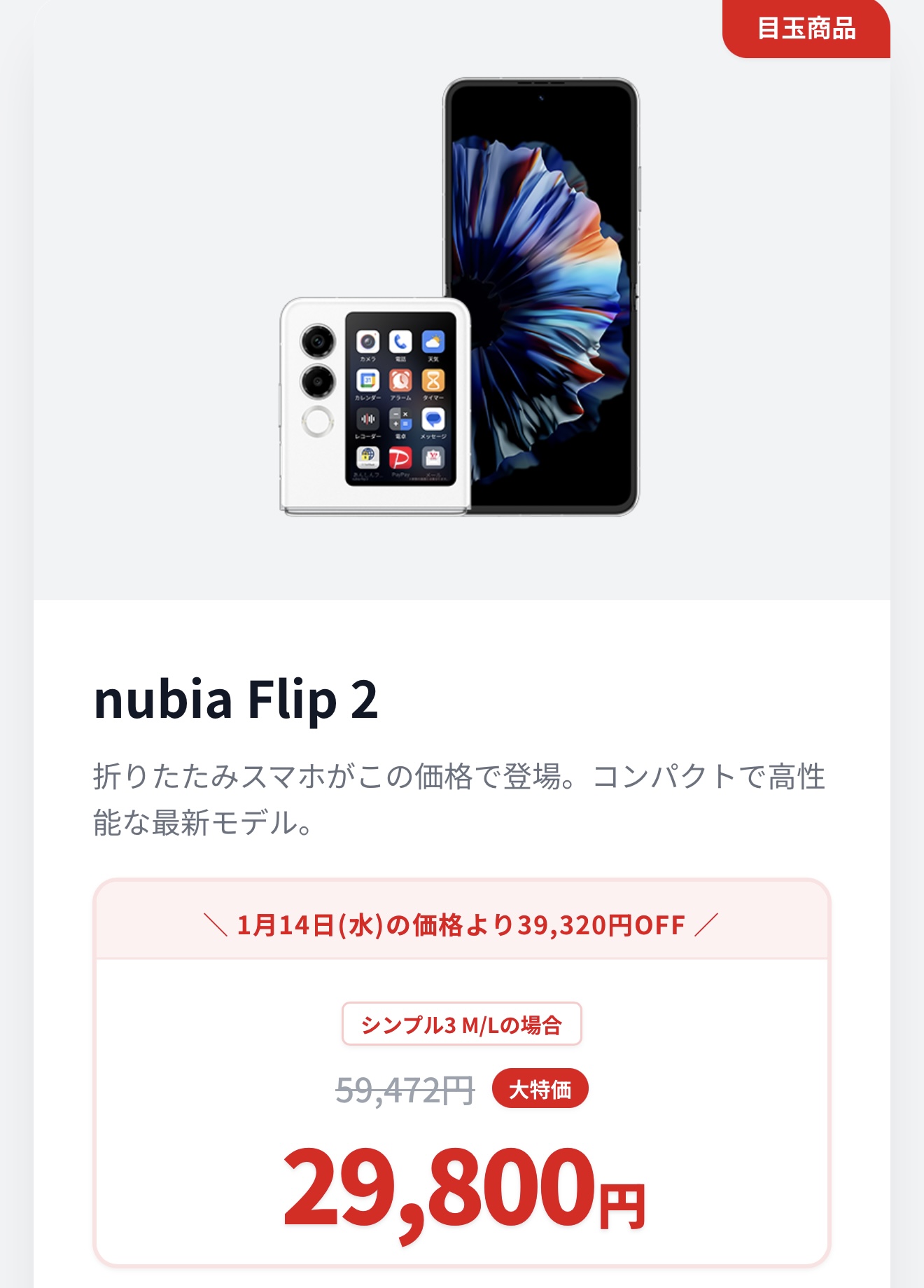 【新規・乗り換え・機種変更同一価格】nubia Flip 2が59,472円⇒29,800円