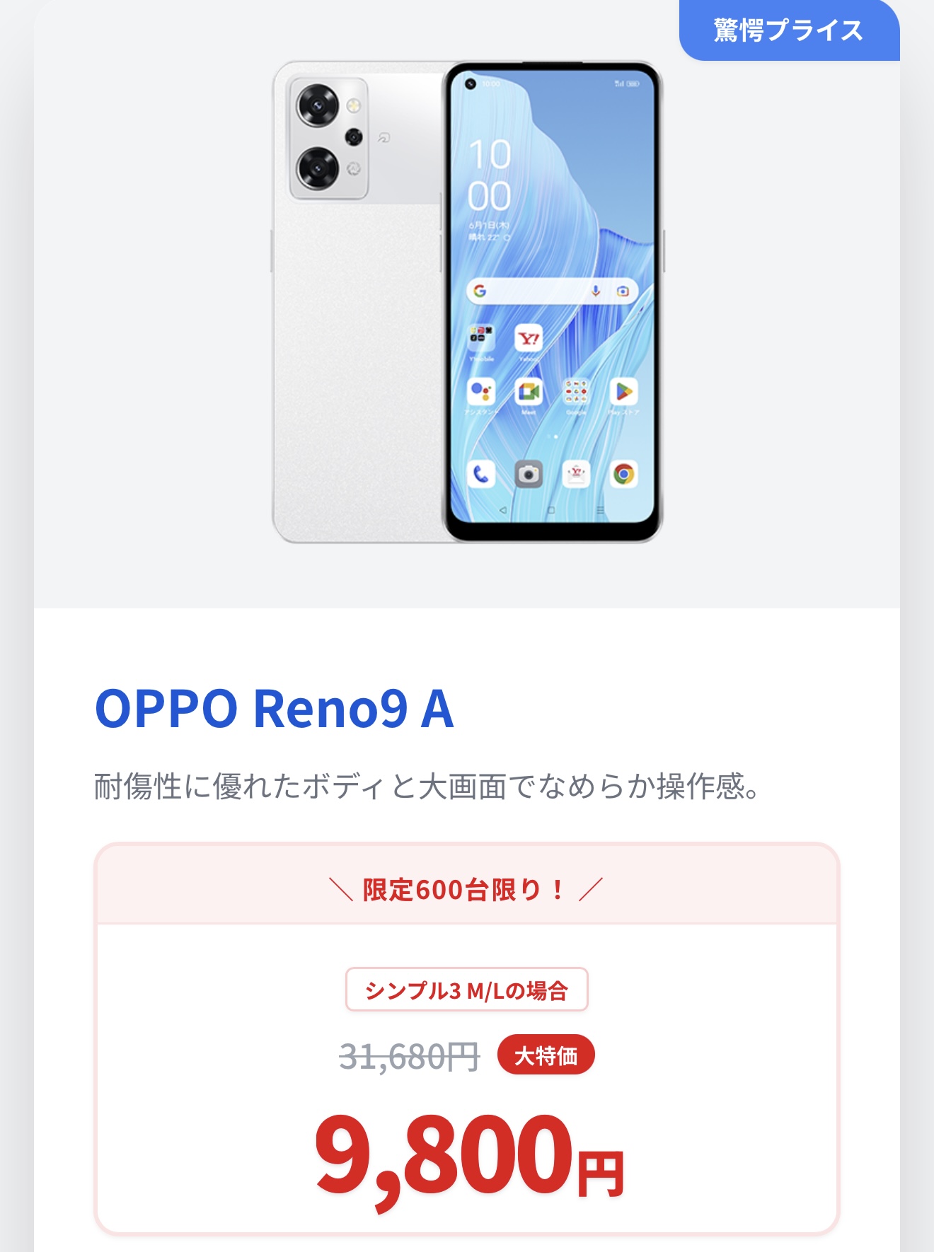【新規・乗り換え・機種変更同一価格】OPPO Reno9 Aが31,680円⇒9,800円
